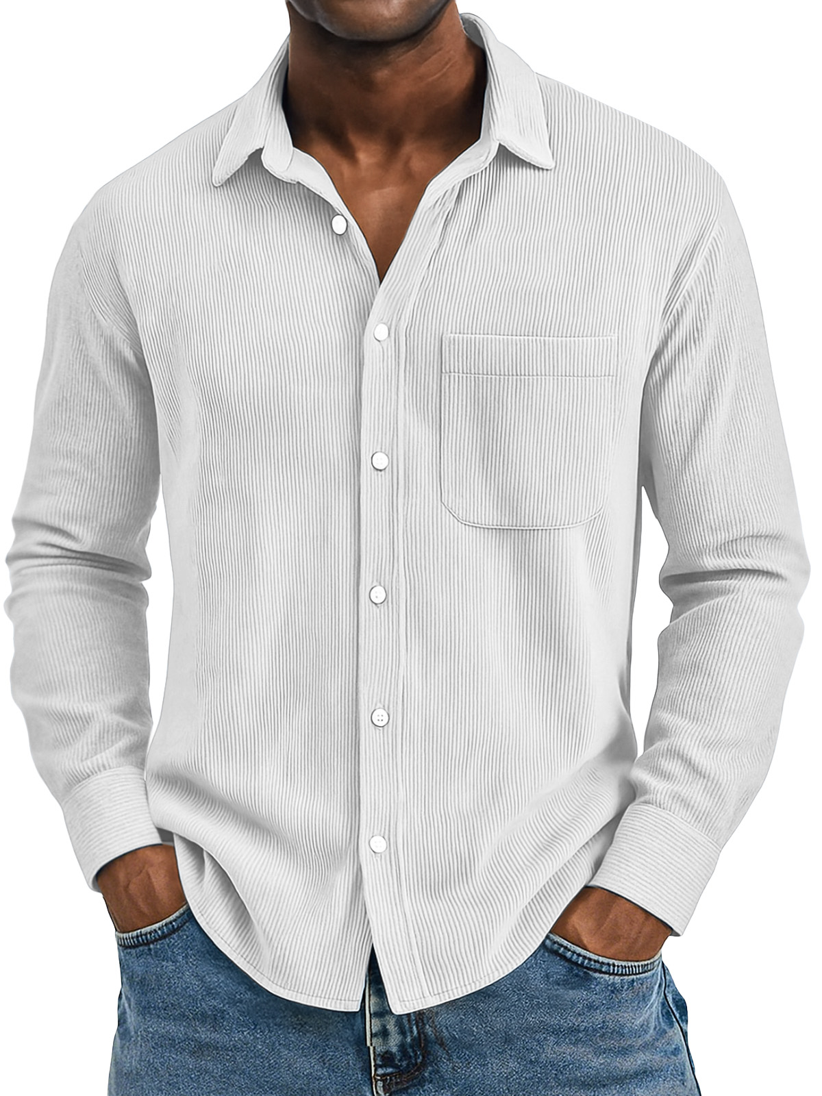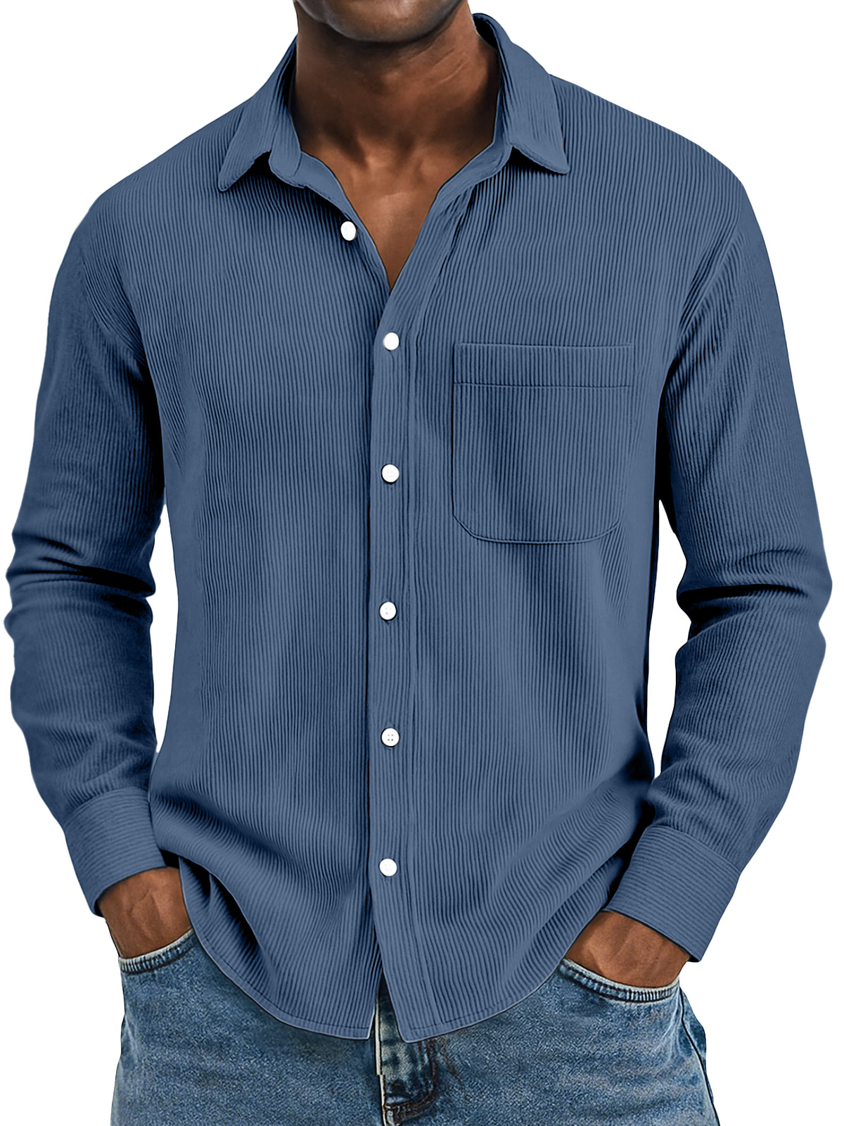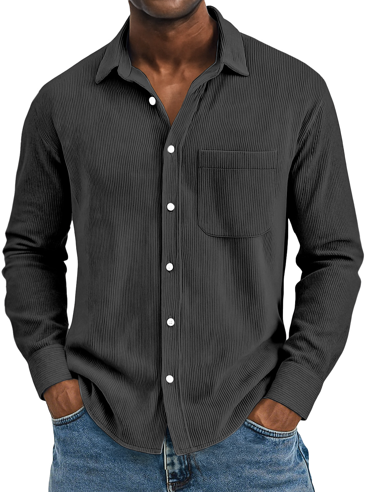 Men's Casual Solid Color Vertical Pit Strip Pocket Lapel Long-sleeved Shirt