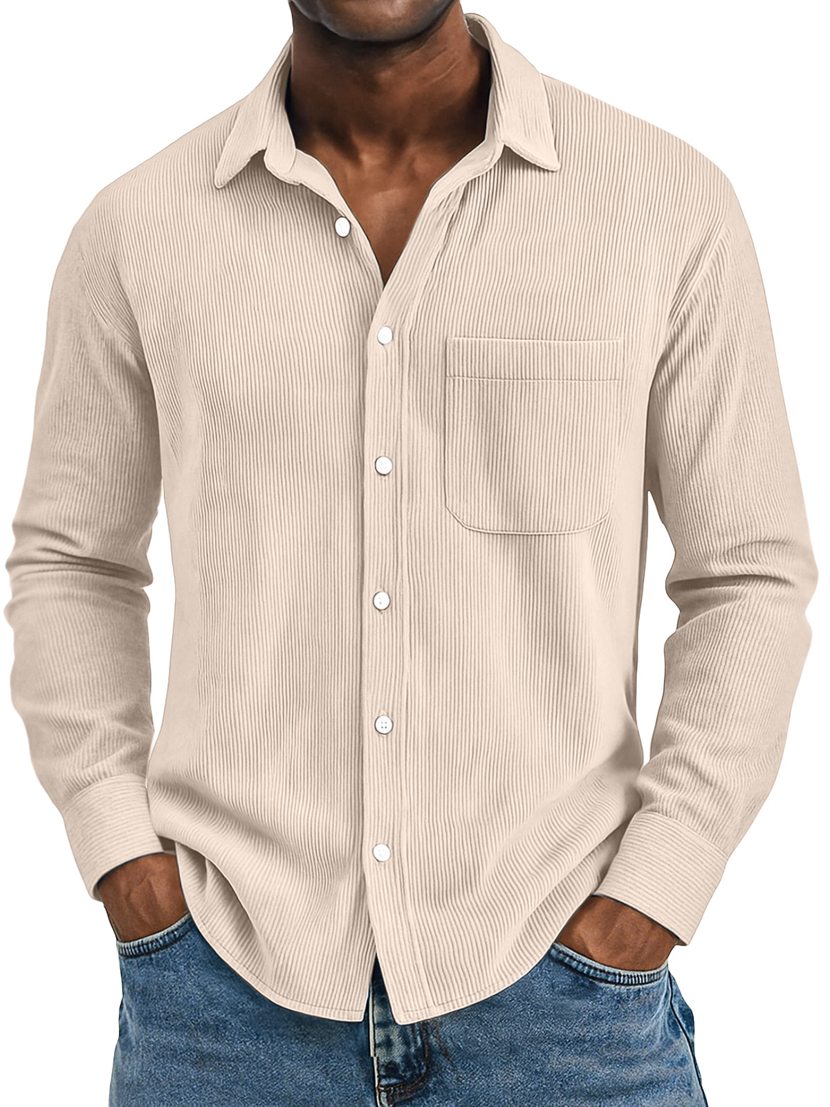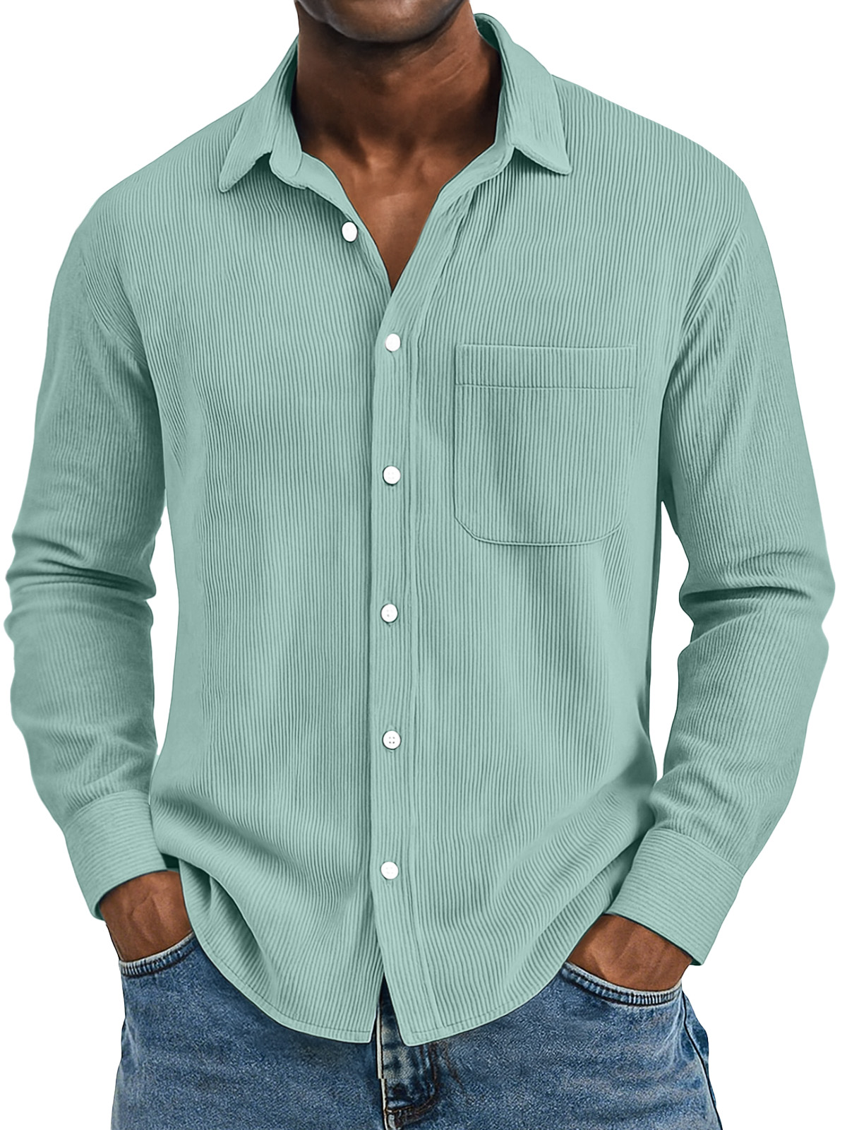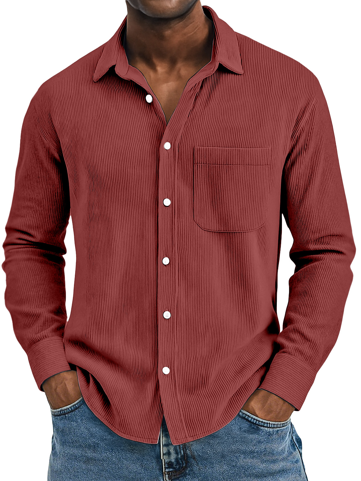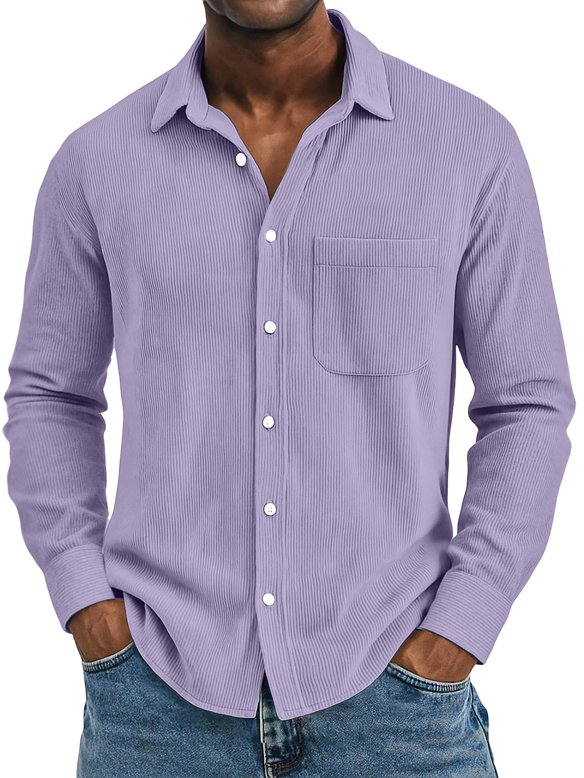 Men's Casual Solid Color Vertical Pit Strip Pocket Lapel Long-sleeved Shirt