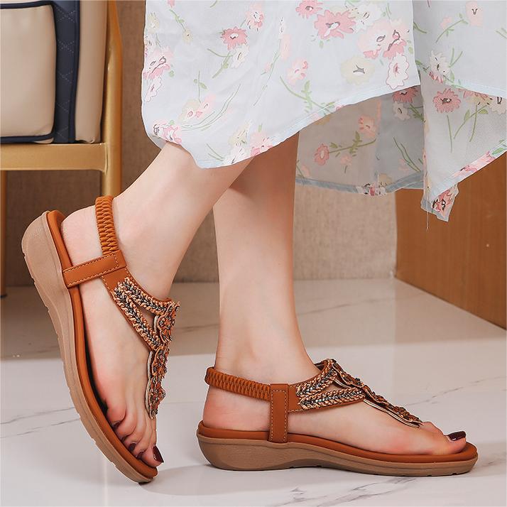 Women's Flat Sandals Ladies Thong Flat Sandals Bohemian Beaded Strap Sandals Diamante Rhinestone Leather Sandals